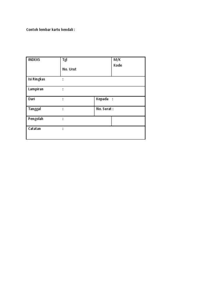 Diperbarui 13 jan 2021, 15:21 wib. Kartu kendali dan tata naskah. Ada empat macam map, yaitu brief twine); Rencana pemeriksaan dari segi obyek pemeriksaan (formulir km_2) 3. Secretaries desk file kumpulan map dengan kode jenis klasifikasi pekerjaan sesuai dengan kelompok berkas yang ditanganinya gambar : Gambar peri, jin, awan, orang berak, dan ikan hiu. Sepertiga halaman berisi sebuah skema sederhana yang sekarang dikenal sebagai peta kendali. Jenis formulir kendali mutu (km) yang digunakan bpkp adalah sebagai berikut: Kedua papan permainan berisi pemain yang sama dalam (apa yang seharusnya) urutan yang sama dengan salah satu pemain. Kartu kendali adalah lembar isisan untuk pencatatan, penyampaian, dan penyimpanan surat, sehingga bila diperlukan dapat ditemukan kembali dengan mudah. Jika menggunakan kartu kendali, satu lembar surat dicatat dalam satu lembar kartu kendali rangkap 3, tidak sanggup beberapa surat dicatat sekaligus dalam satu kartu kendali. Gambar ini dapat ditemukan di bagian troubled history dari sport tersebut saat anda kembali ke museum untuk mencari taylor. Setelah anda mendapatkan kendali sebagai john dan kembali ke jalan, belok kiri di jalan tanah kecil menuju sebuah rumah.