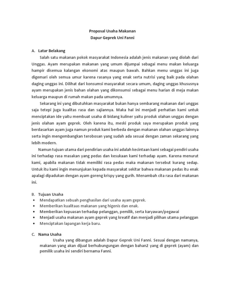 Pelajaran ini mempelajari tentang keahlian dalam berkarya. 1.2 gambaran umum usaha kedai kuliner layhan makanan . Proposal usaha makanan ringan "rempeyek udang" mata kulyah kewirausahaan. Untuk mengetahuinya, simak penjelasannya dalam artikel ini. Dalam membuat usaha makanan, kamu perlu membuat proposal usaha makanan.